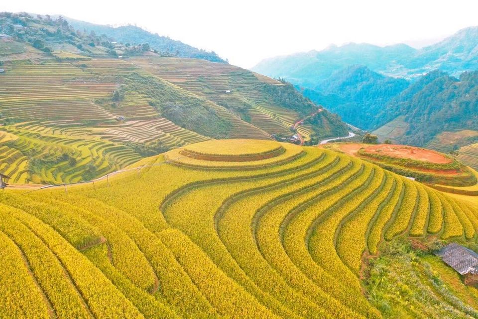 Mùa lúa chín, Đồi Mâm Xôi La Pán Tẩn kỳ vĩ, với biển vàng như một tuyệt tác của thiên nhiên. Những vạt lúa ngả vàng theo ánh vàng của nắng thu, những sóng vàng theo đường viền uốn lượn quanh ngọn đồi, cứ thế mà chạy lên đỉnh trời. Từ trên cao nhìn xuống, ngọn đồi tựa như một tuyệt phẩm, lúa chín vàng, trĩu nặng bông như một chiếc mâm khổng lồ đang đựng vô vàn sóng lúa. Du khách vẫn hay truyền tai nhau rằng những thửa ở đây đẹp nhất là vào sáng sớm, khi nắng bắt đầu le lói xem với làn sương mờ. Cảm giác giống như lạc vào một miền đất hứa, đi giữa biển vàng mênh mang khói trắng. Nếu lúc bình minh trên Đồi Mâm Xô rực rỡ sắc màu thì khi hoàng hôn buông xuống khung cảnh sẽ có phần tĩnh lặng hơn như một bức tranh phong cảnh trữ tình. Từ sắc vàng hồng ấm áp, bầu trời chuyển dần sang màu tím mơ mộng rồi buông xuống biển lúa vàng màn đêm tĩnh lặng đầy yên bình. Đây là lúc sắc tím hoàng hôn nhuộm lên khung cảnh biến mọi thứ trở nên huyền ảo hơn. Trên hết thời điểm này cũng là lúc chúng ta có thể hít hà hương thơm đặc trưng của lúa chín.