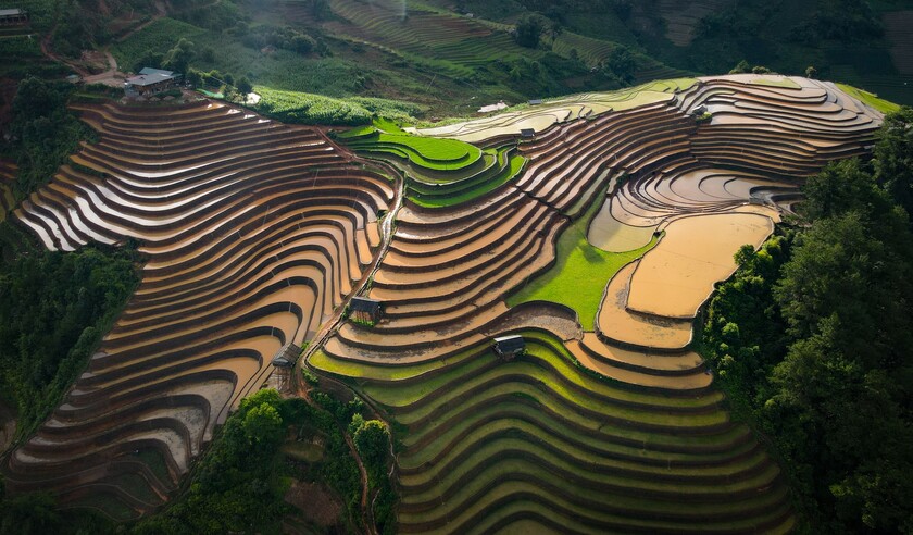 Nếu lần đầu tiên khám phá xã La Pán Tẩn, có lẽ bạn sẽ ngay lập tức choáng ngợp trước cảnh đẹp nơi đây với ruộng bậc thang điệp trùng bủa vây tứ phía. Là một trong những xã có ruộng bậc thang nhiều nhất Mù Cang Chải nên nhìn đâu bạn cũng thấy ruộng lúa điệp trùng. Ruộng bậc thang là điều mang lại vẻ đẹp quyến rũ bậc nhất của xã. Tại đây có một địa điểm siêu nổi tiếng mà ai tới Mù Cang Chải cũng phải ghé qua tham quan đó chính là đồi Mâm Xôi của xã. Ngọn đồi này được nâng đỡ bởi những thửa ruộng bậc thang bên dưới, bên trên có dáng tròn tựa một chiếc mâm dâng lên trời. Khung cảnh vô cùng nên thơ trữ tình. Những cánh đồng ruộng bậc thang đều tăm tắp, nhìn từ trên cao giống với những vân của cây gỗ lớn, nhưng thực sự đẹp hơn nhiều. đồi Mâm Xôi đẹp nhất vào sáng sớm bình minh khi nắng vàng vừa len nhẹ lên những thửa ruộng, chung quanh còn những làn sương trắng lờ mờ bao phủ, vẽ nên một bức tranh đẹp như tiên cảnh. Gần đồi Mâm Xôi có một lán gỗ nhỏ của người dân, là nơi mà du khách có thể ngồi ngắm cảnh và thỏa thích chụp ảnh.
