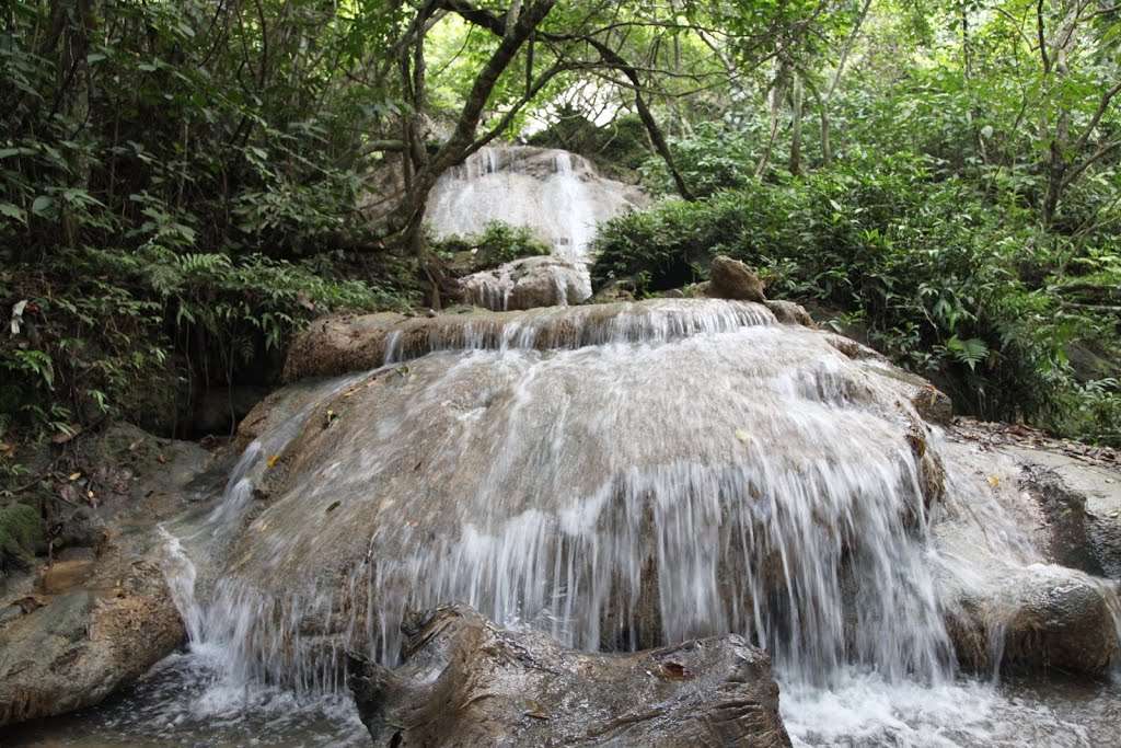 Tầng thứ nhất của điểm thác 4 tầng trải dài khoảng trên 30 mét, dòng nước đổ từ trên cao xuống. Tầng thứ hai dàn trải như một hồ nước nhỏ bọt tung trắng xóa - đây là điểm lý tưởng nhất để du khách có cảm giác mạnh nếu có nhu cầu thả mình theo dòng thác để thư giãn. Tầng thứ 3 lại được thắt lại giống hình miệng phễu khiến cho khung cảnh thật huyền ảo, cuốn hút lòng người. Tầng thứ 4 như một rèm cửa trong cung điện nguy nga, đổ từ trên cao 5 mét xuống. Điểm thác 4 tầng này là nơi ấn tượng nhất để du khách có thể lưu lại những hình ảnh đẹp có một không hai khi lên Mù Cang Chải.